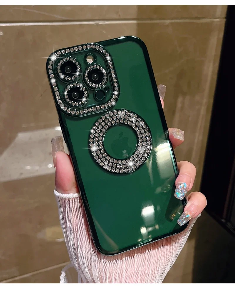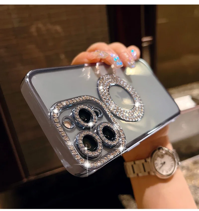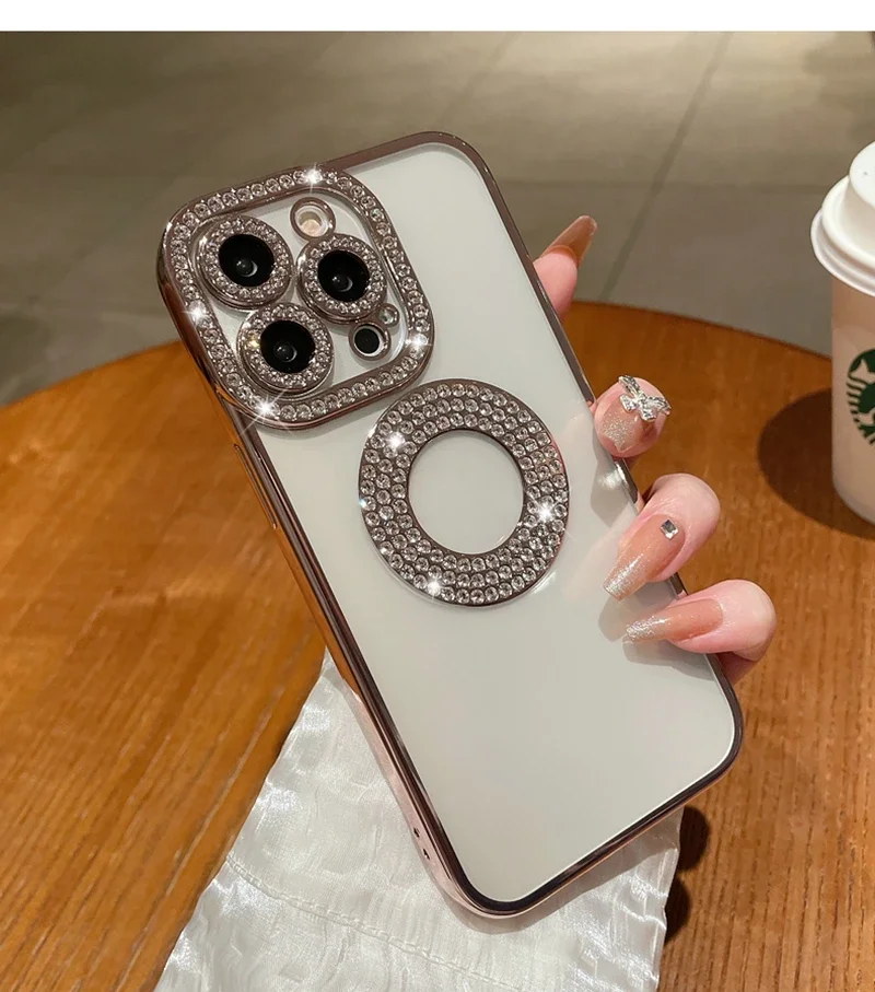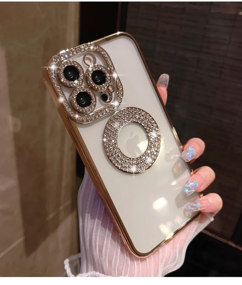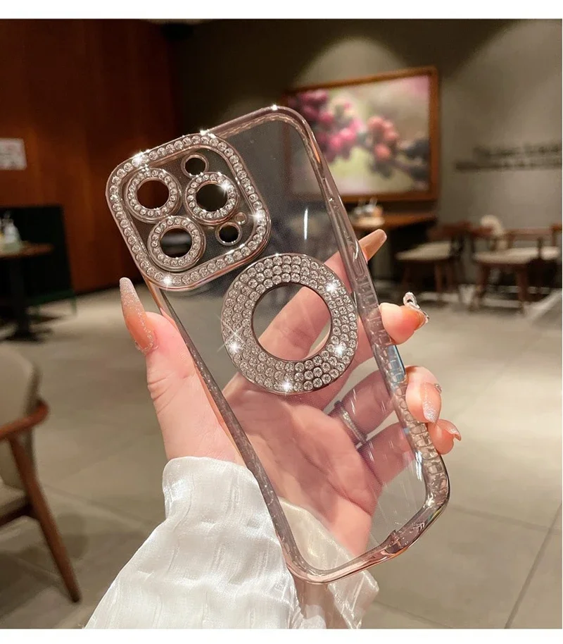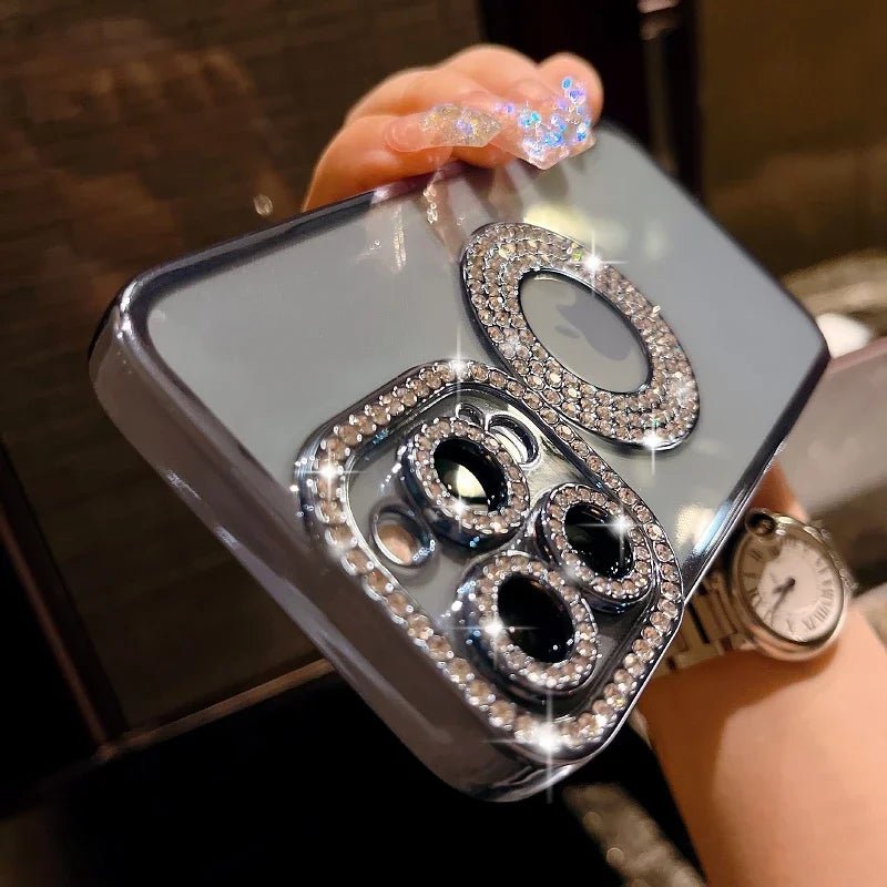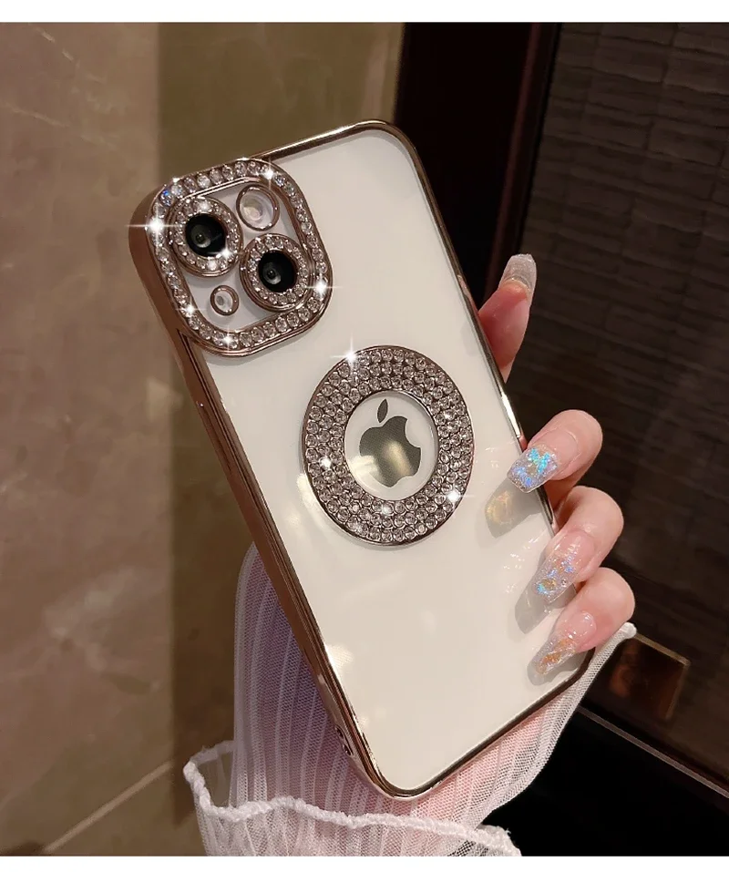 Electroplated Transparent Case For iPhone 11 12 13 14 15 Pro Max Plus Hollow Out Glitter Bumper Soft Rhinestone Cover