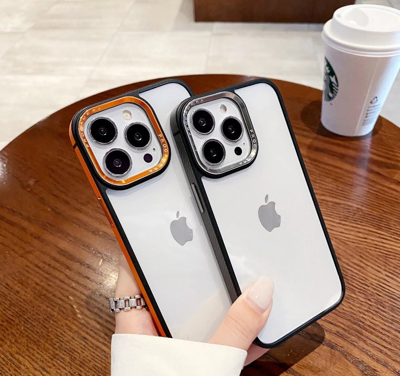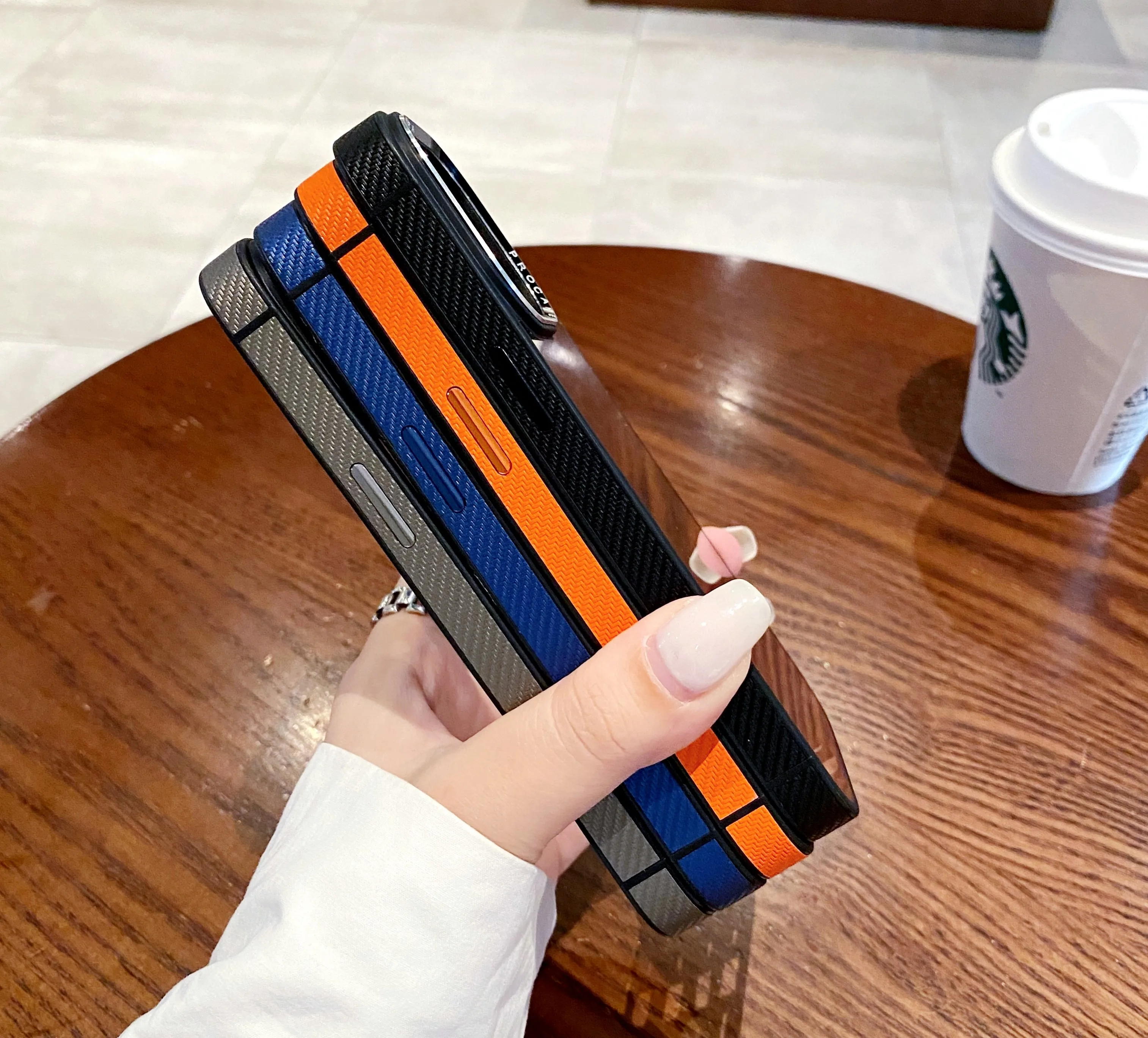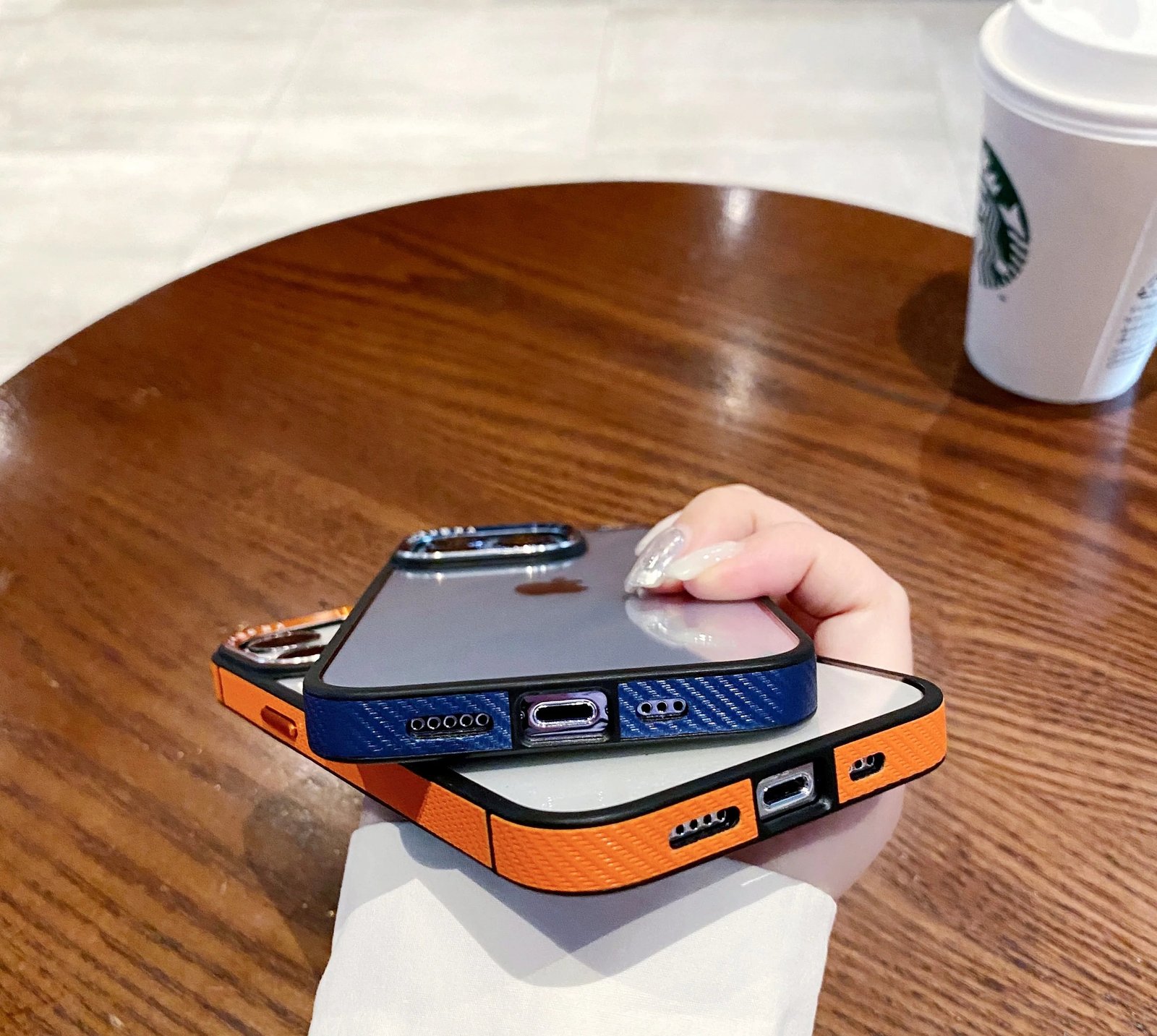 Luxury Carbon Fiber Texture Leather Frame Phone Case For iPhone 15 14 13 12 Pro Max Plus Metal Lens Protection Transparent Cover