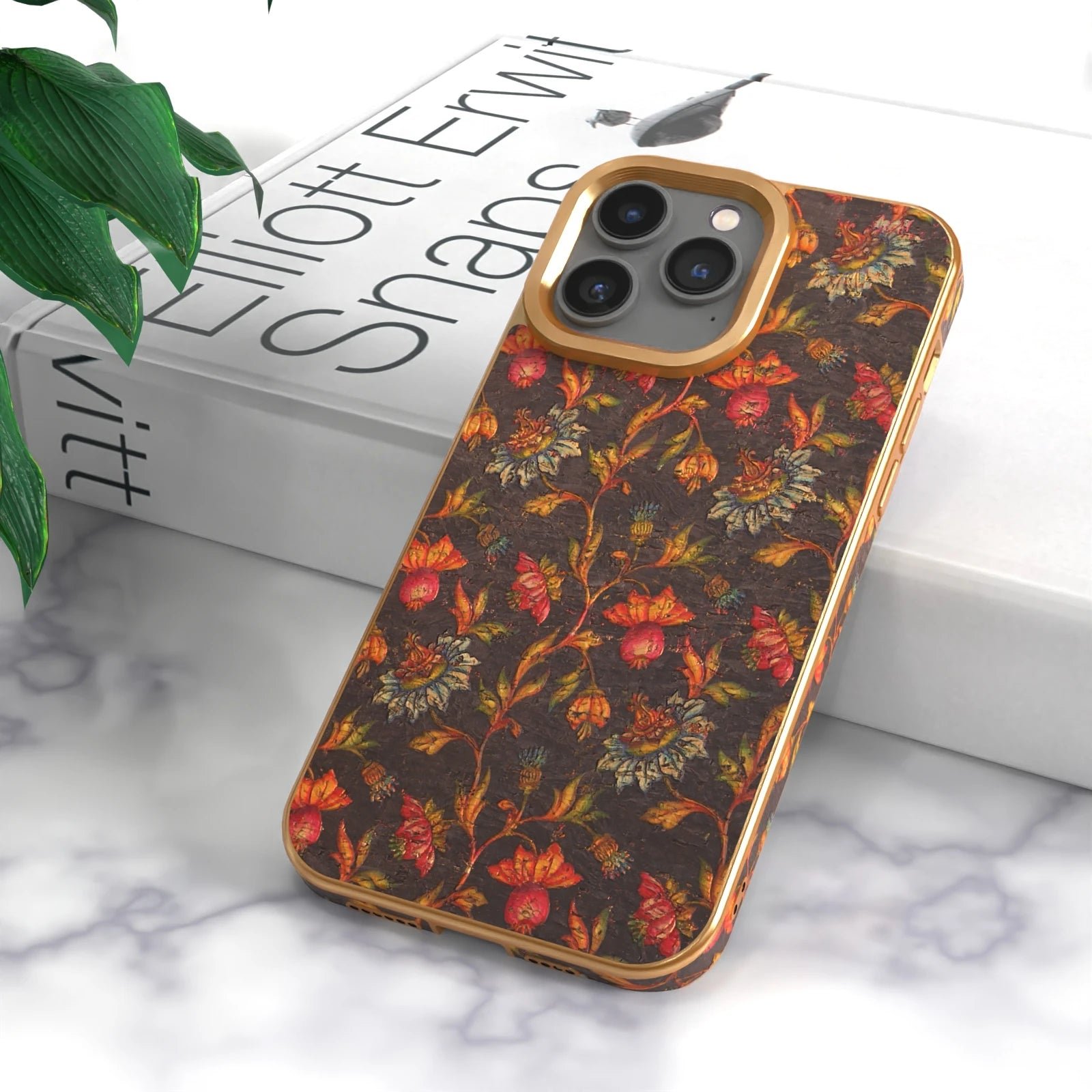 • Floral Texture Luxury Wooden Phone Case For iPhone 12 13 14 15 Pro Max Plus Plating Frame Lens Protection Shockproof Cover Funda